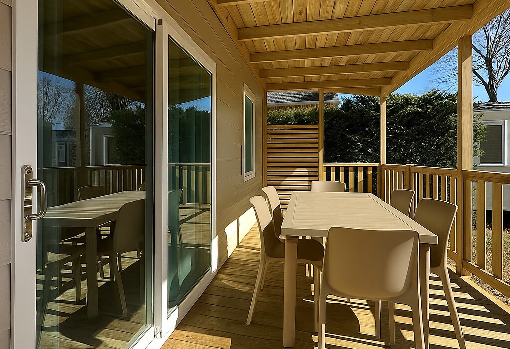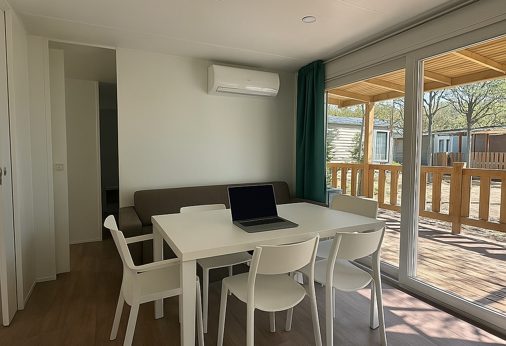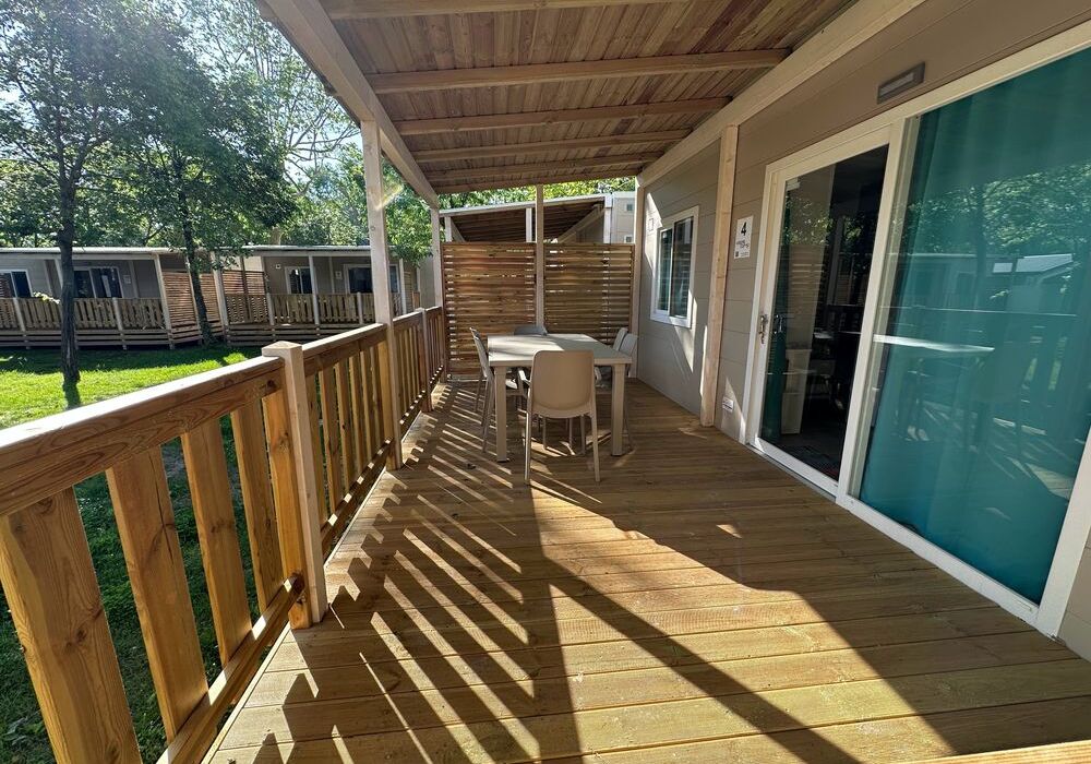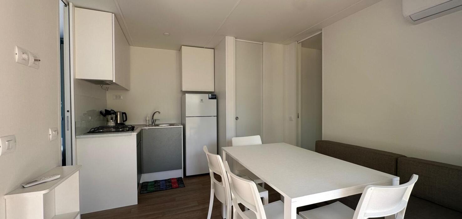 Nel salotto si trova un soggiorno, una tavola con sedie e angolo cottura completamente equipaggiato (di tutti gli utensili e stoviglie). All’esterno una terrazza in legno coperta, con dei mobili da giardino (una tavola e 4 sedie).