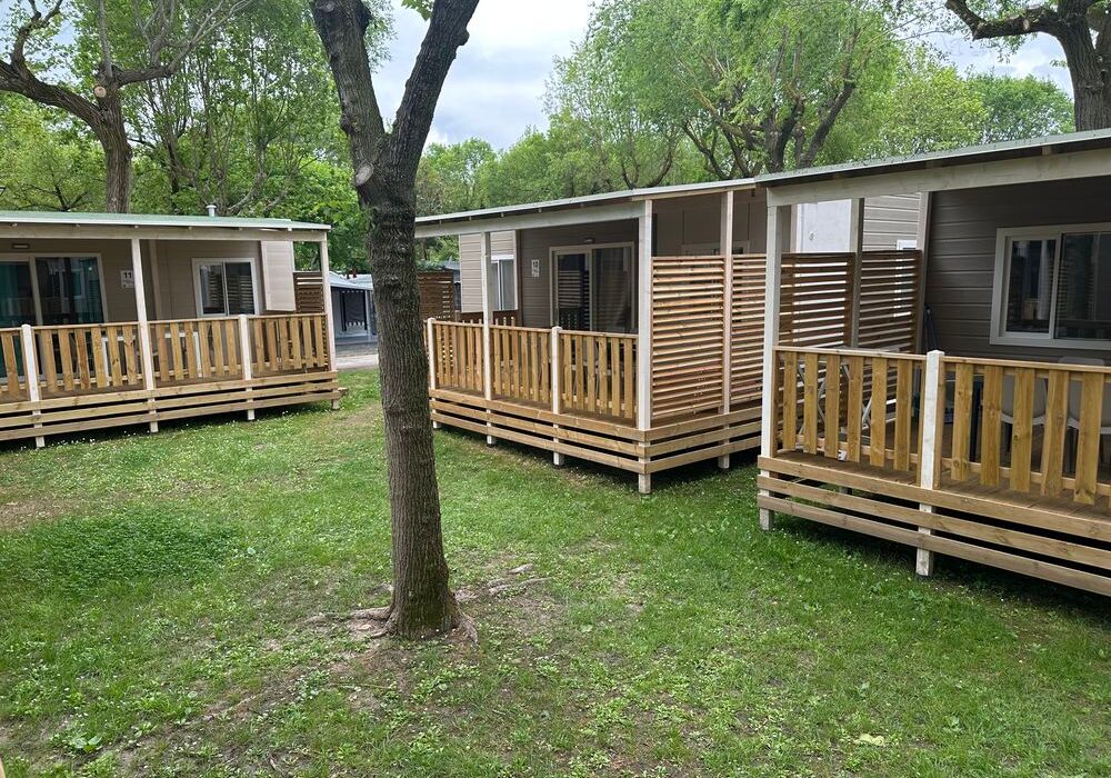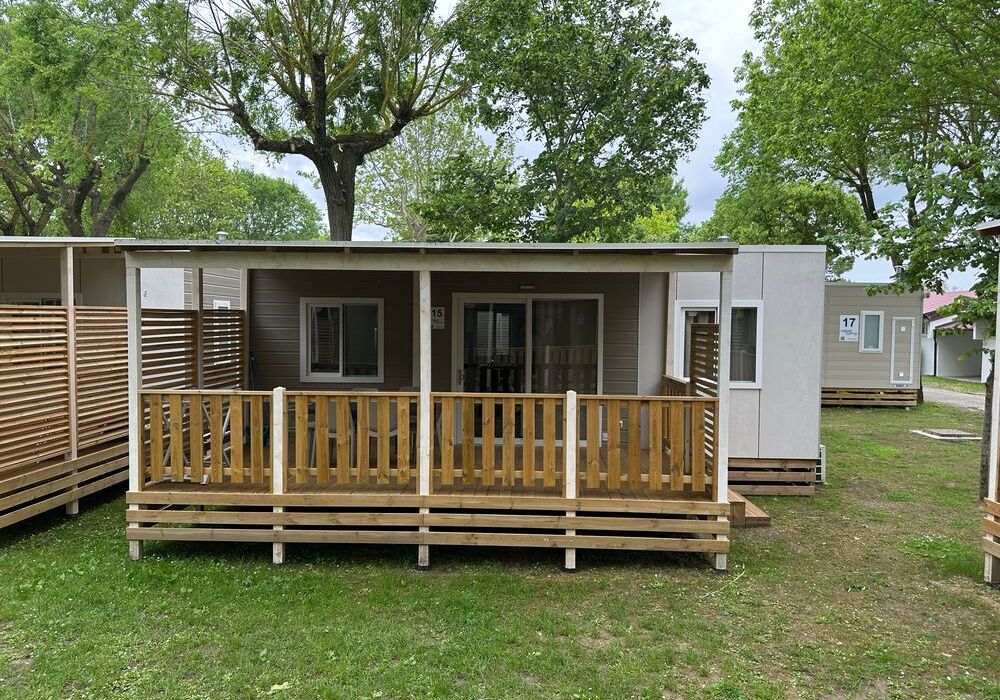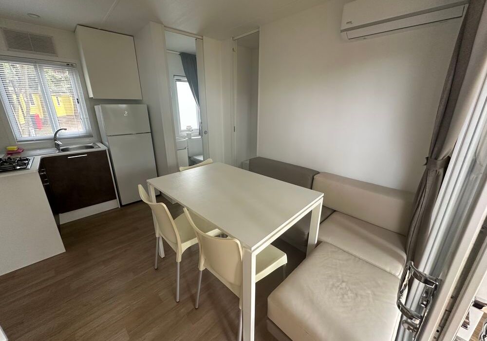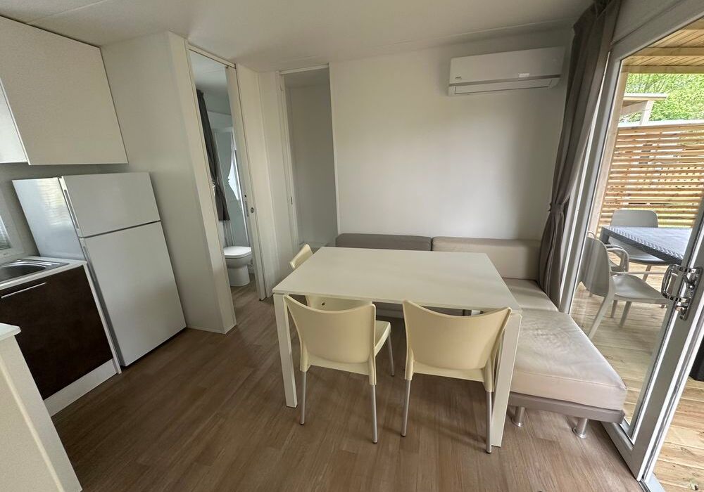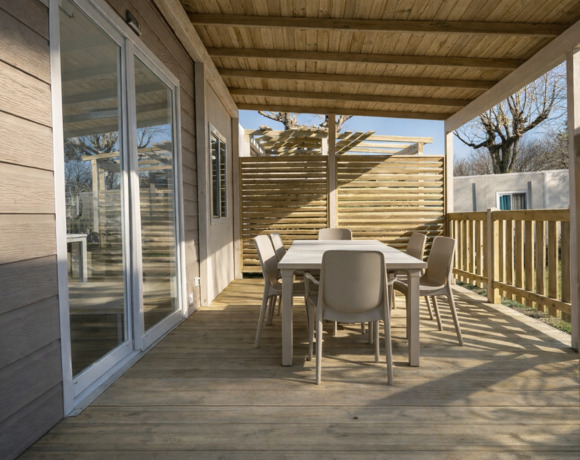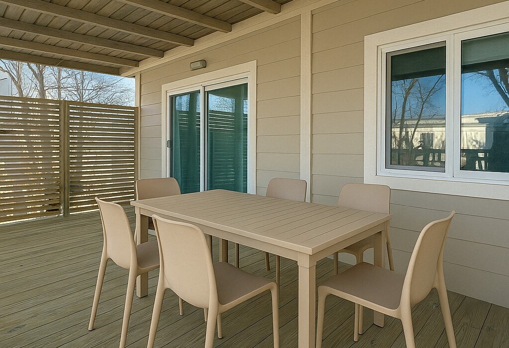 The living room has a seating corner, a table with chairs, and a fully equipped kitchenette (complete tableware). Outside there is a fully covered fenced wooden terrace with garden furniture (table and 4 chairs).
