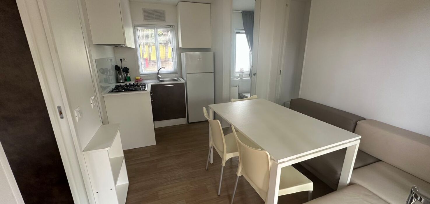 The living room has a seating corner, a table with chairs and a fully equipped kitchenette (complete tableware). Outside there is a covered wooden terrace with garden furniture (table and 4 chairs).