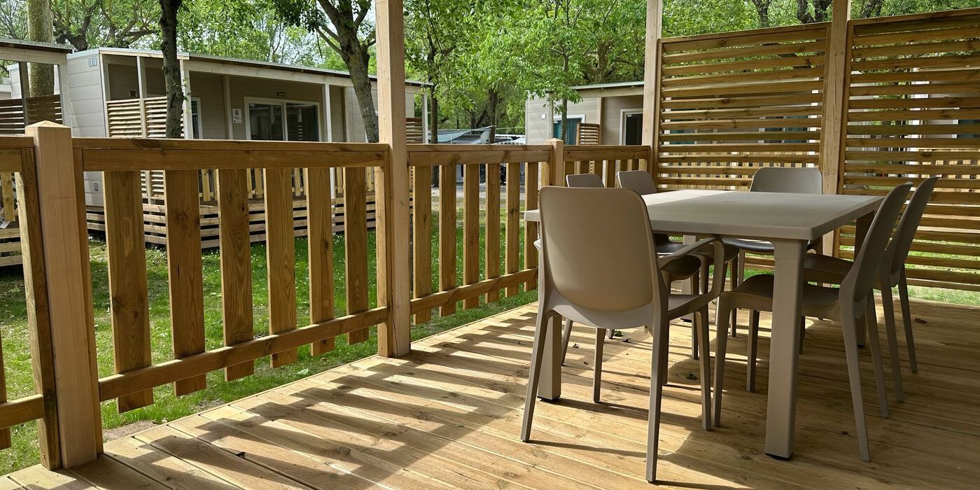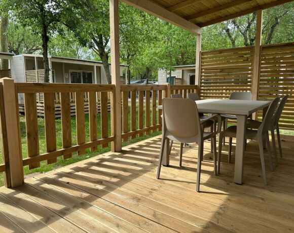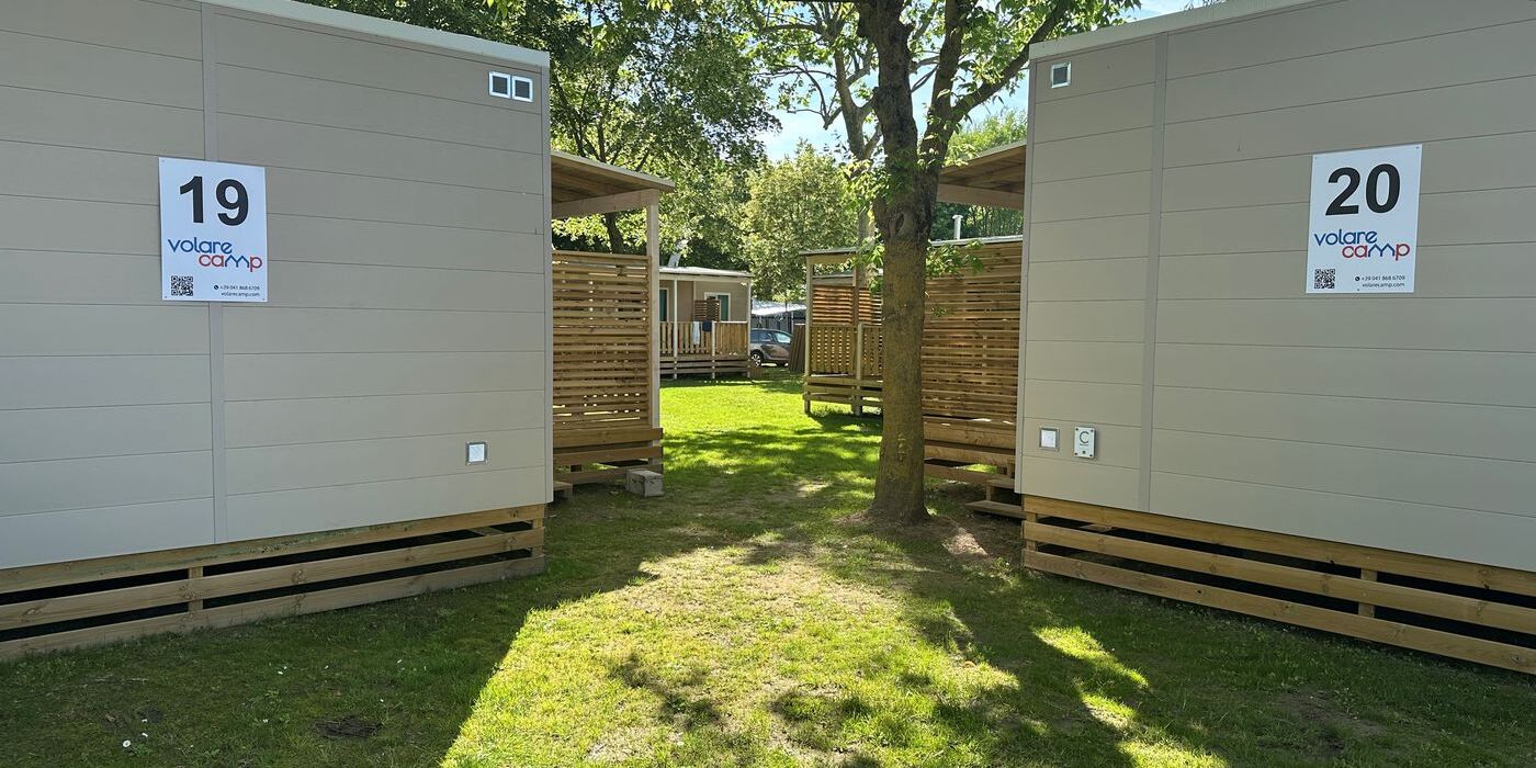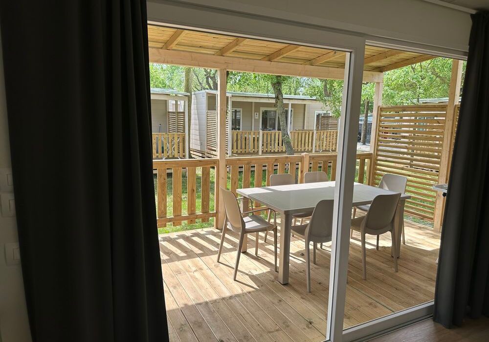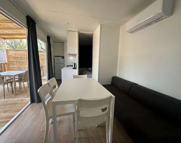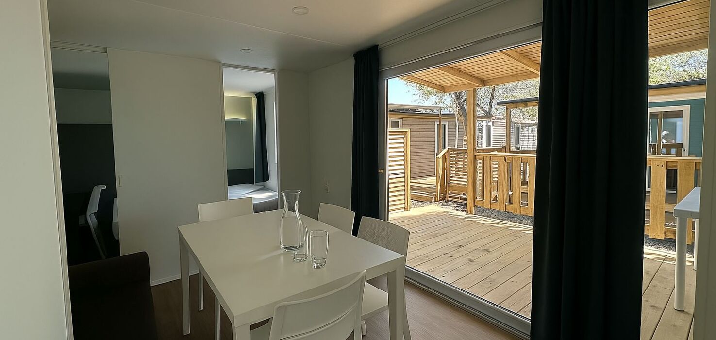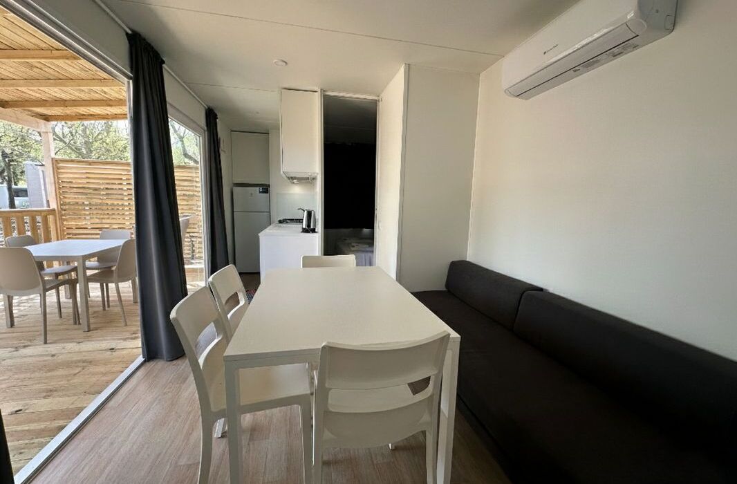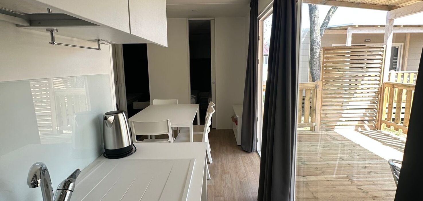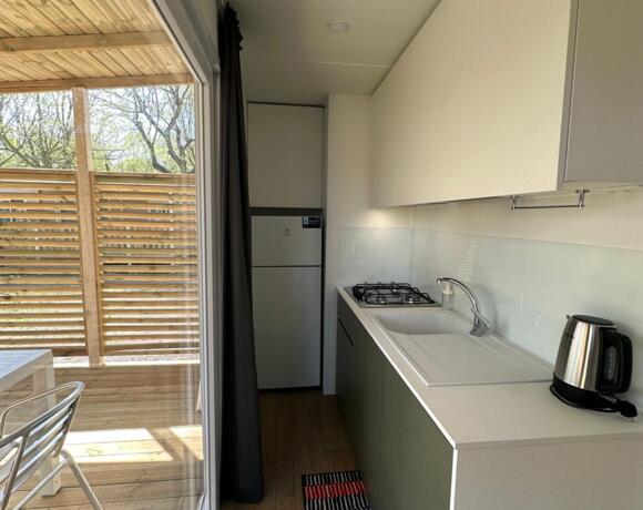 Mobil home Premium Deluxe Garden to największy i najbardziej komfortowy dom mobilny w ofercie Volare Camp. Kuchnia jest bardziej oddzielona niż w pozostałych domach mobilnych i jest wyposażona w zmywarkę.