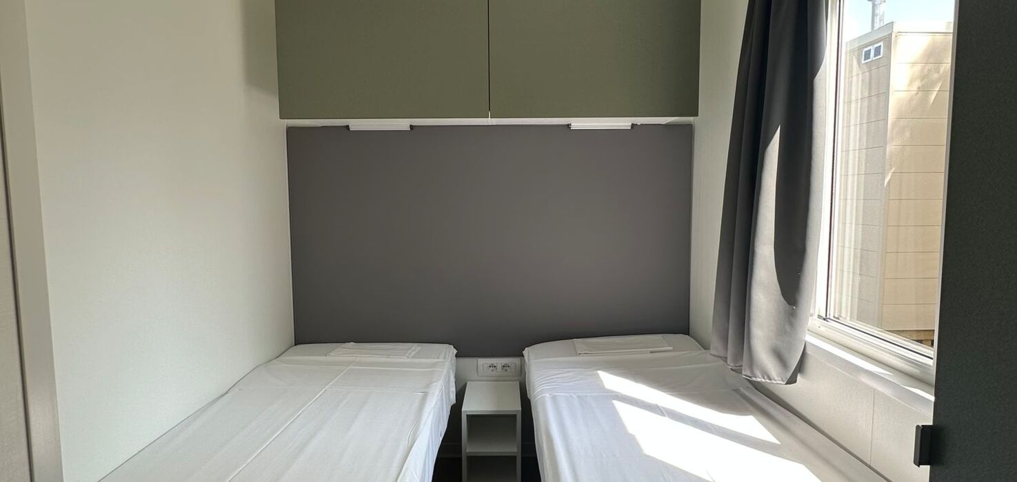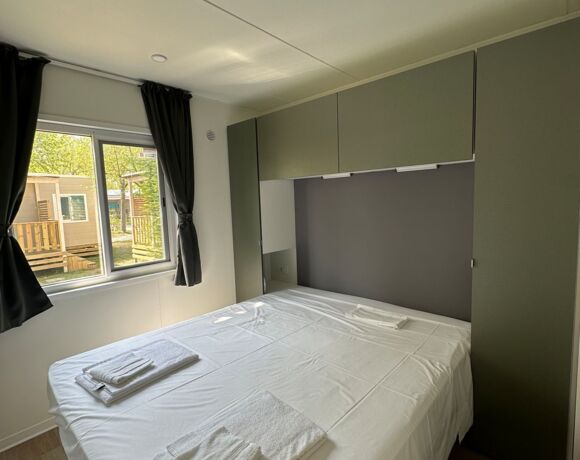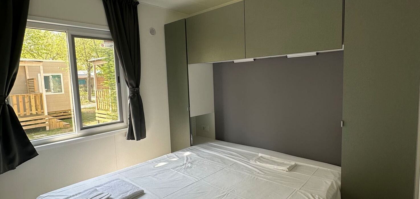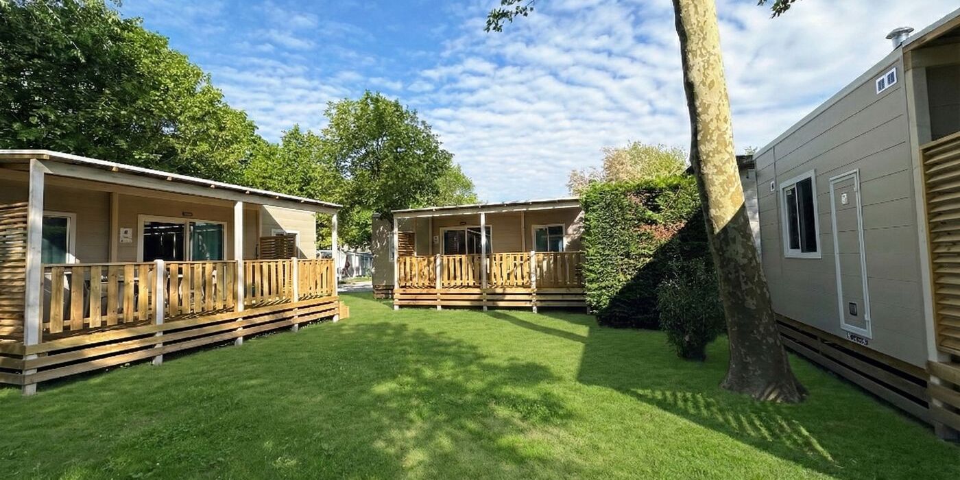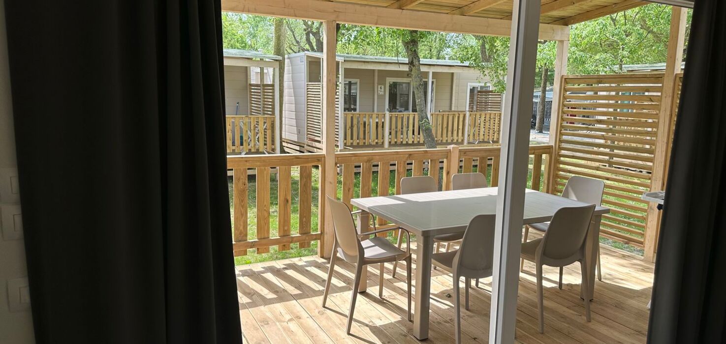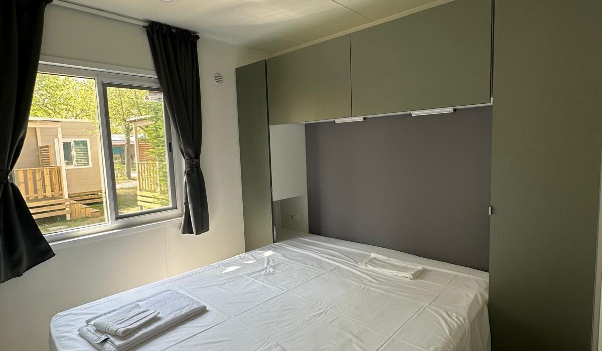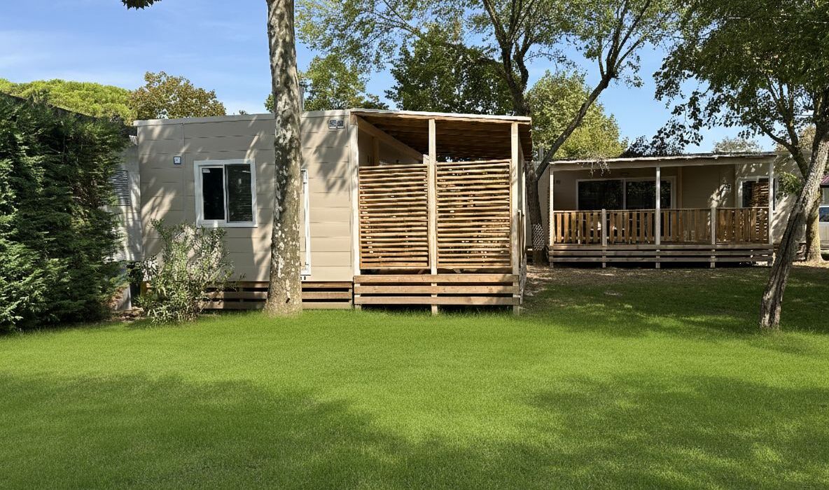 Mobil home Premium Deluxe Garden to największy i najbardziej komfortowy dom mobilny w ofercie Volare Camp. Kuchnia jest bardziej oddzielona niż w pozostałych domach mobilnych i jest wyposażona w zmywarkę.
