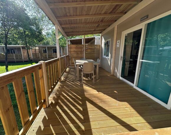 W salonie znajduje się kąt wypoczynkowy, stół z krzesłami oraz aneks kuchenny w pełni wyposażony (kompletna zastawa stołowa). Na zewnątrz znajduje się zadaszony drewniany taras z meblami ogrodowymi (stół i 4 krzesła).